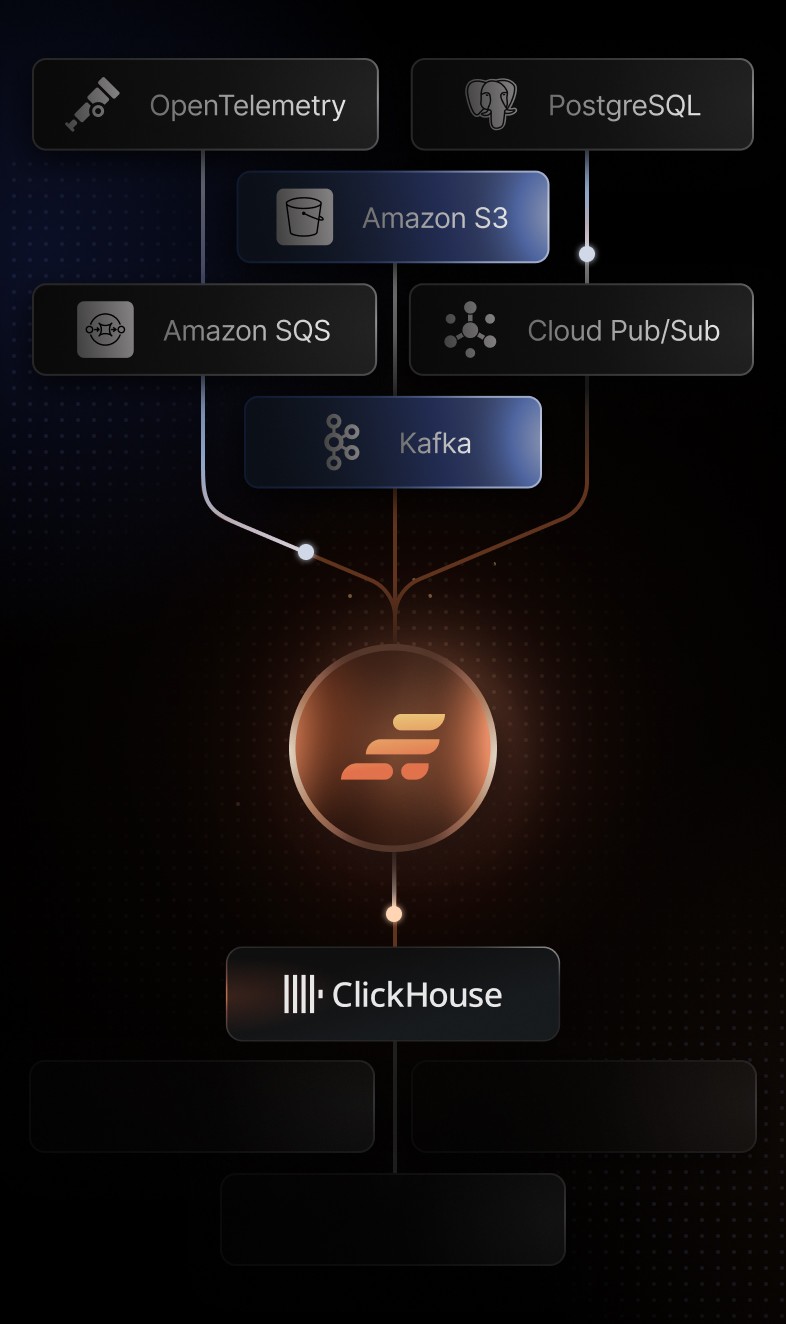 Connect GlassFlow to integrations like, Kafka, OTEL, Postgres, and more. Our ClickHouse connector uses the native protocol for the best performance and experience.