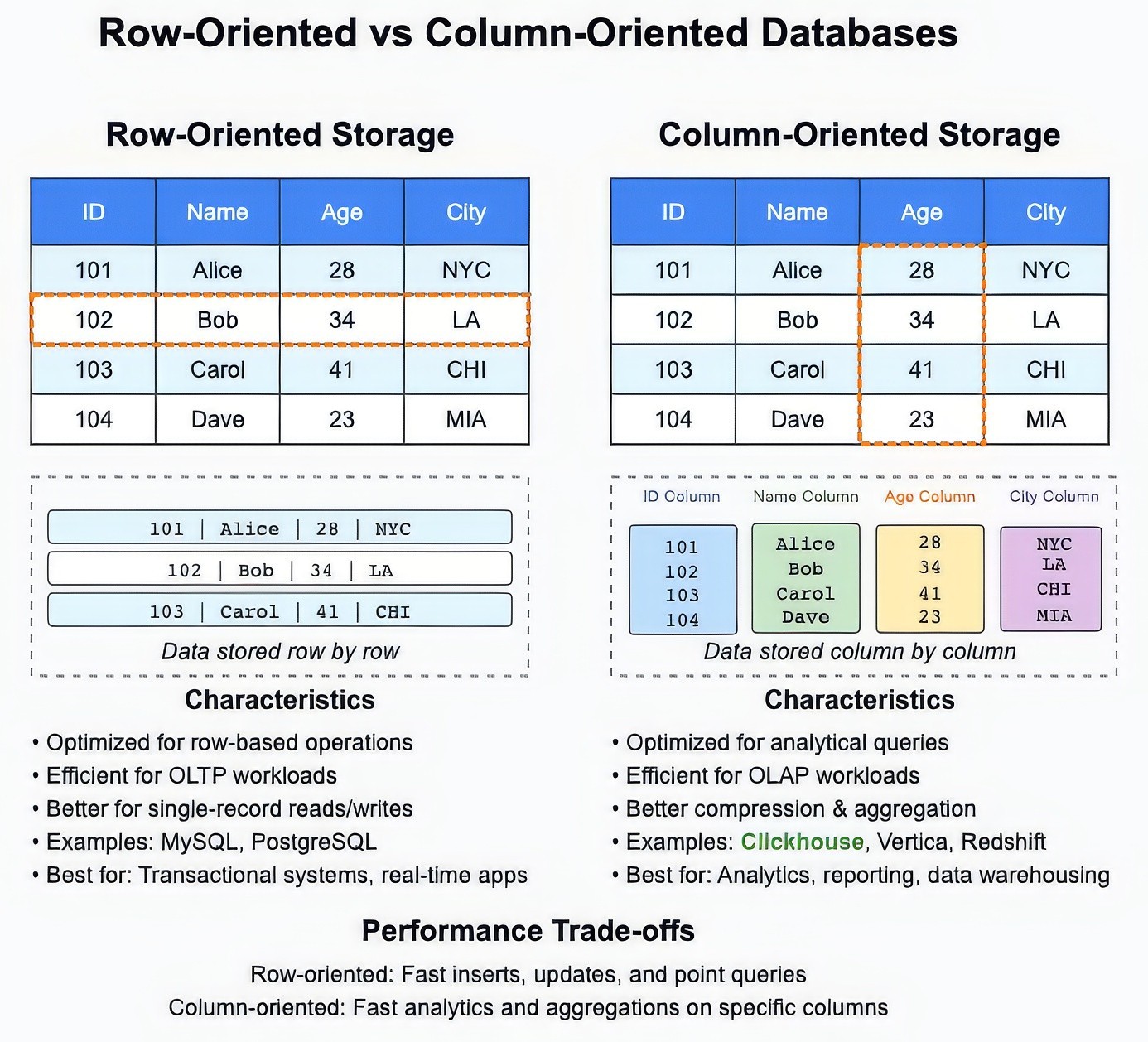 To understand it’s strengths and limitations, it’s crucial to grasp the concept of column-oriented storage. Traditional DBMS systems like MySQL are row-oriented, which meant that data is stored sequentially by rows. While this structure resulted in really good performance for inserting and deleting records, there are major bottlenecks in querying, filtering, and aggregating data (i.e., Analytical queries). The reason for this bottleneck is that even if you need data from one or two columns, the system must read entire rows from disk, wasting valuable I/O resources.