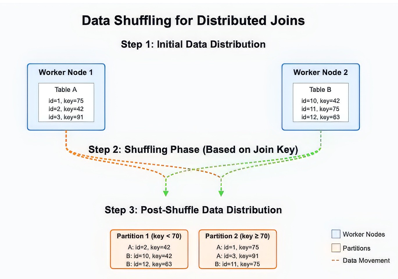 No Data Shuffling: In distributed databases, data shuffling allows worker nodes to share relevant data chunks instead of each node processing the entire table (refer to Figure 4). Clickhouse lacks this feature, so each node processes its part of the data independently and then combines the results. This works fine for simple queries but becomes painfully slow (or even fails) for complex JOINs involving large tables.