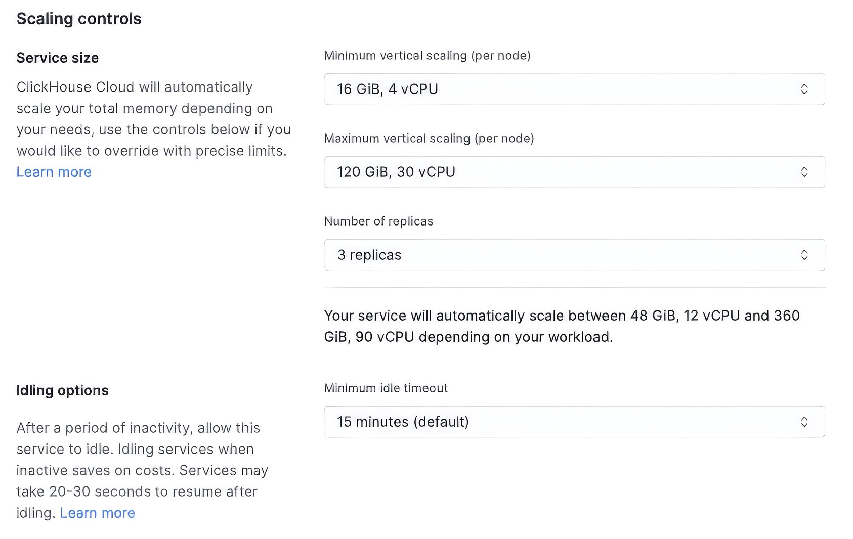 ClickHouse Cloud: For this article, I am running a cloud instance of ClickHouse to ensure a realistic, production-grade setup. The service is configured to auto-scale based on workload demand, with the following parameters: