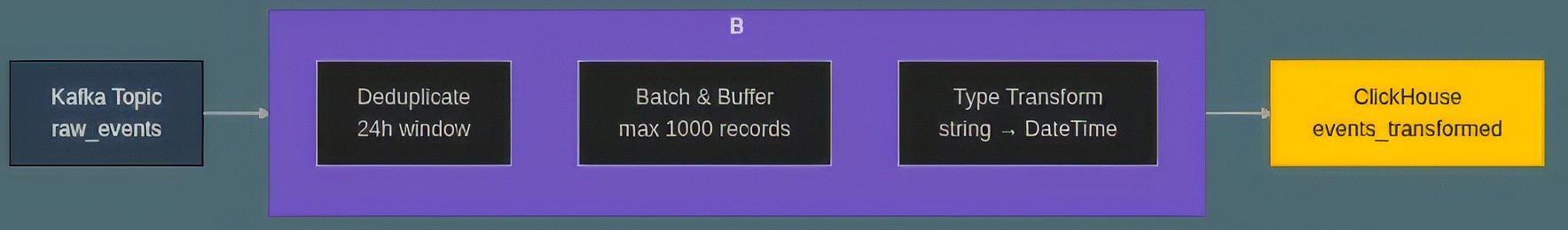 The batch-oriented workflow is ideal for the initial historical data load, but it's not a solution for continuous, real-time ingestion. For live data from sources like Kafka, a dedicated stream processing layer is required. A tool like GlassFlow is built precisely for this purpose, acting as an intermediary that can consume a raw stream, apply stateful transformations like time-windowed deduplication, sort records for optimal ingestion, and then write clean, ordered batches into a ClickHouse sink. This automates the entire "transform and load" pipeline for live data.