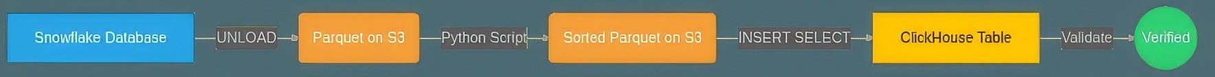 This is the most critical stage for future performance. Data that is perfectly structured for Snowflake's micro-partitioning is not optimized for ClickHouse's MergeTree engine. The objective here is twofold: flatten any nested JSON data into a clean, columnar structure, and—most importantly—physically sort the Parquet files according to the columns that will form your ClickHouse table's ORDER BY key. If your table will be ORDER BY (event_date, user_id), your Parquet files must be sorted by event_date then user_id. This pre-sorting allows ClickHouse to perform a zero-copy-like ingestion, as the data is already in the order it needs to be on disk.